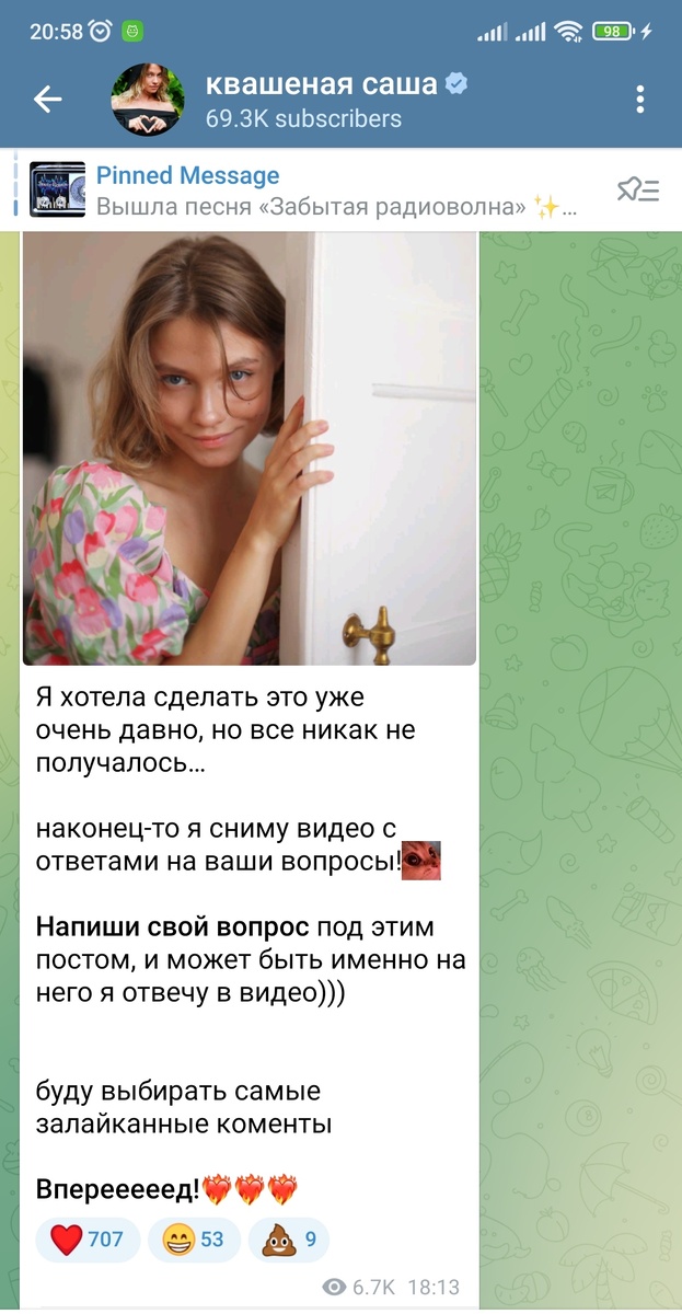 Здравствуйте, мои уважаемые читатели. Рада, что вы снова заглянули ко мне на страницу. Прежде чем я начну свой рассказ о том, что меня повергло в шок- не то что бы я расстроилась, просто была немного сбита с толку и непроизвольно родился вопрос : "А что, так можно было?" Перед тем как я расскажу про эту ситуацию, мне бы хотелось обозначить свою позицию по отношению к творчеству Саши Квашеной (Капустиной). Мне нравятся многие каверы в ее исполнении, есть авторские песни, которые я слушаю с удовольствием. Однозначно, я хорошо отношусь к некоторым гостевым стримам. Безусловным успехом Саши считаю ее участие в Музлофте у Стаса Ярушина. Да вы и сами могли прочитать на моей платформе несколько статей о Саше и ее творчестве. Опираясь на всё выше сказанное я зашла сегодня в её Телеграмм Канал, где Саша предложила писать вопросы, на которые она ответит в одном из свои видео. Что я и сделала, и между делом стала ждать выберут ли его для ответа. Признаюсь, что я посмела предположить, что отб