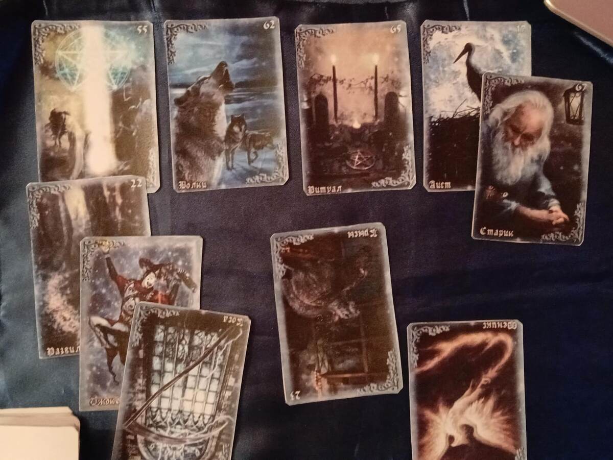 Взгляд цепляется за 2 карты, которые указывают, на магические действия – МАГИЯ на первый вопрос и РИТУАЛ на четвертый. Понимаю, что просто так 2 магические карты в простеньком раскладе не могут выпасть просто так!!!