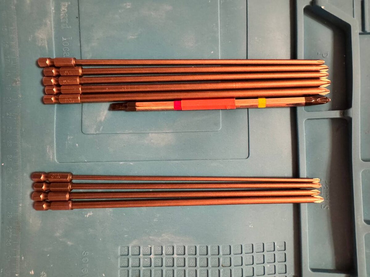 Совсем недавно я разбирая какой-то китайский аппарат столкнулся с проблемой, что моя обычная бита PH2 даже с удлинителем просто не пролезает в отверстие. Я замерил диаметр отверстия и оказалось, что он меньше чем диаметр моей биты. И тут я начал искать решение. Как оказалось крепеж под крестовую биту может отличается диаметром шляпки, даже есть этот тот же самый PH2. И посмотрев многие видео в интернете эта проблема не только у меня. На алиэкспресс я нашел набор бит, так еще и 200мм, чтобы уж точно везде пролезть без удлинителей. Но это был "кот в мешке" потому что мало отзывов, да и они еще блестящие на фотках. По моему опыту это означает пластилиновый материал. Но решил заказать. Они приехали. На деле они оказались матовыми, магнитные, материал реально твердый и хороший. Решил я их вставить в шуроповерт и они были без биения. Саморез держит хорошо, так что при работе он не будет выпадать. Я был приятно удивлен от китайского качества данных бит. А вот их типы размеры 1x200 мм * Φ3.