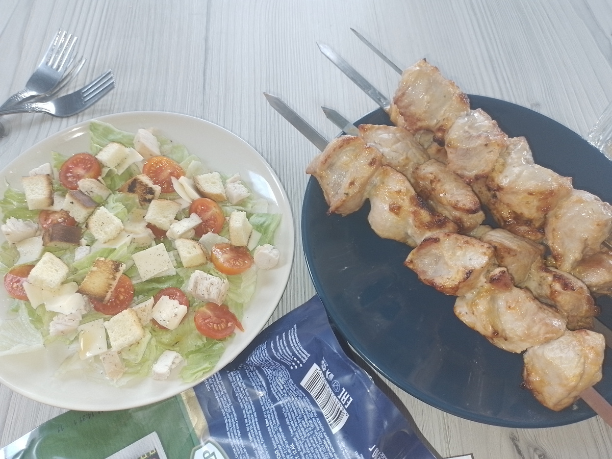 В обед посидели семьей в узком кругу. Приготовили шашлык и салат "Цезарь". Плюс тортик и арбуз. Без изысков.
