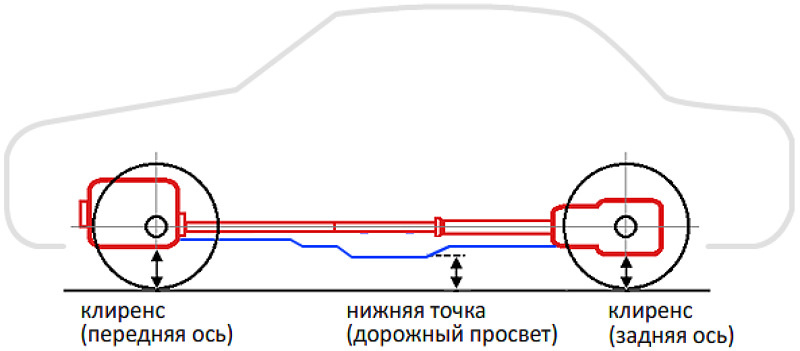 Дорожный просвет также называют клиренсом. Слово clearance в переводе с английского означает «зазор».Согласно ГОСТу, клиренс — это расстояние между опорной поверхностью и самой нижней точкой центральной части автомобиля. Говоря простыми словами, это расстояние между самой нижней точкой автомобиля (не считая колёс) и дорогой.Клиренс можно представить как максимальную высоту препятствия на ровной дороге, которое автомобиль может проехать так, чтобы не задеть его.Эта нижняя точка может принадлежать разным деталям: переднему бамперу, глушителю, защите картера или элементу подвески.