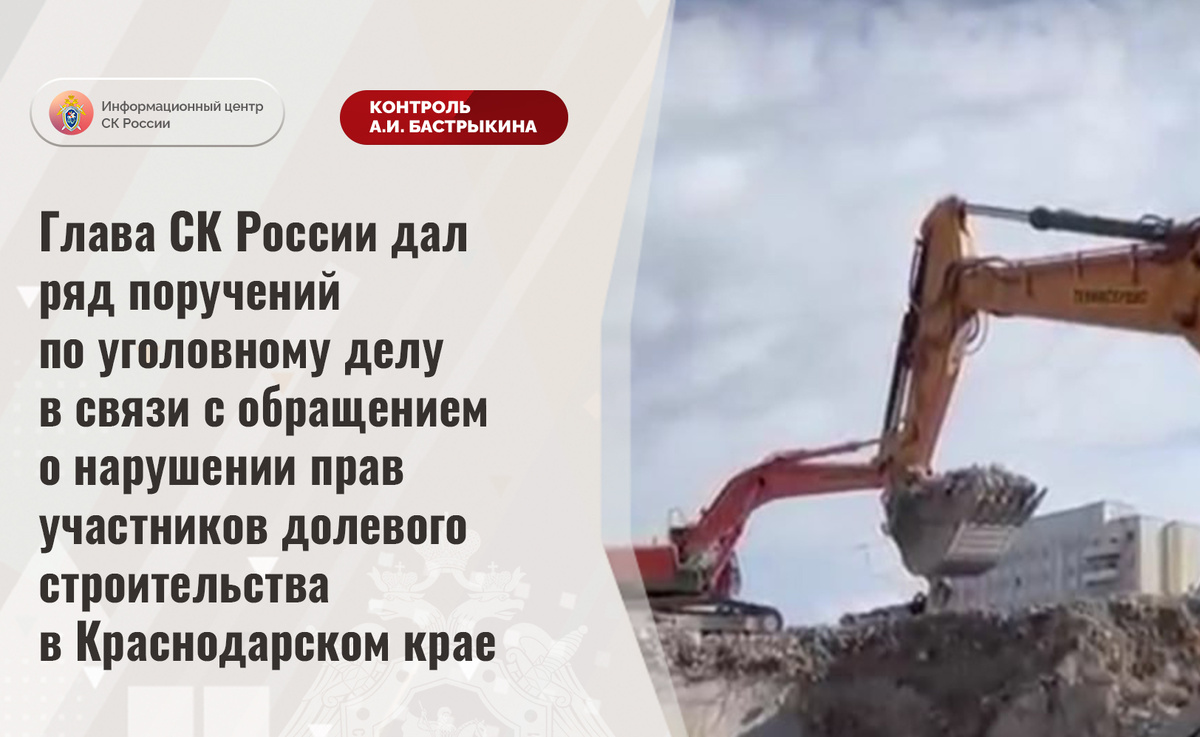Ранее А.И. Бастрыкин ставил указанную ситуацию на контроль в центральном аппарате ведомства. В СУ СК России по Краснодарскому краю расследуется уголовное дело в отношении представителей застройщика. Также в региональном следственном упра