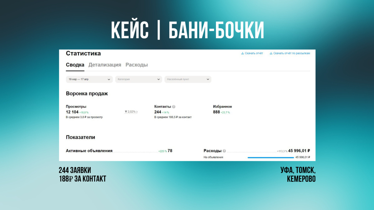 Кейс по настройке рекламы на Авито в нише бани-бочки на продажу и под заказ. Над проектом работала Кристина Саргсян