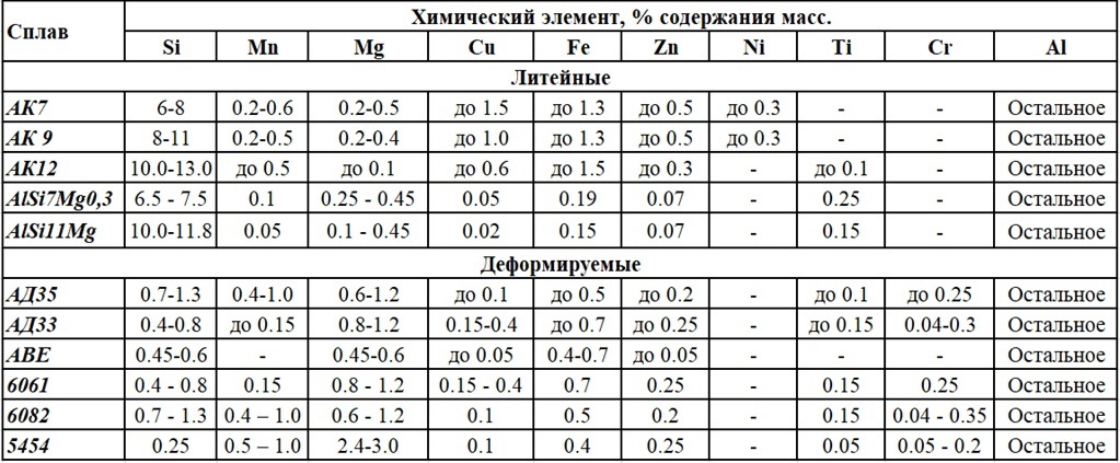 С развитием автомобилестроения росла и потребность в улучшении методов производства автомобильных деталей, в первую очередь колес. Ранние методы включали раскатку и штамповку стальной полосы с последующей сваркой, что обеспечивало массовое производство и относительно низкую стоимость продукции. Точность геометрии и балансировка дисков были, сравнительно, невысокими, однако, эксплуатационные свойства таких колес были достаточными. В последствии, с увеличением мощности автомобильных двигателей повысились и требования к остальным деталям, в том числе и к колесам [1]. В современных реалиях производства автомобильных дисков все чаще применяются алюминиевые сплавы, которые обеспечивают надежность, возможность получения сложных конфигураций дизайна спиц и, что не мало важно, такие колеса легче стальных аналогов на 20-30%. Перечень отечественных марок алюминиевых сплавов, которые наиболее популярны при производстве колес, представлен в таблице 1. На текущий момент времени, чаще всего применяю