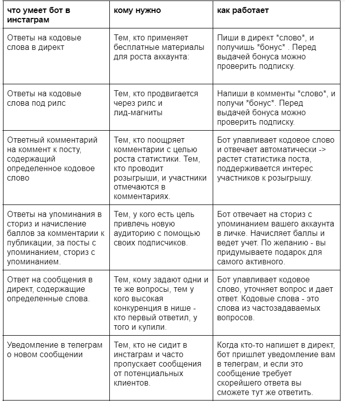 Автоматический ответ подписчикам, мгновенная отправка заготовленного сообщения... А что еще можно сделать с помощью чат-бота в инстаграм? Я расписала варианты сценариев для чат-бота, которые помогут вам набрать аудиторию, поддерживать ее активность, при желании переводить в телеграм и почти не тратить на это времени. Независимо от того, на какой платформе будет собран чат-бот, потребуется доступ к аккаунту фейсбук, и фейсбук-страница без ограничений.
