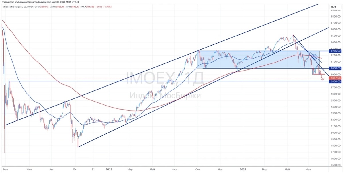 😱Началось? Шторм на финансовых рынках по всему миру добавил ускорения Фондовые рынки вчера ожидаемо открылись гэпом вниз на фоне падения международных рынков. Индекс Токийской фондовой биржи рухнул почти на 10% на фоне данных о росте безработицы в США. Это сильнейшее падение со времен "чёрного понедельника" 1987 года. Другие ключевые фондовые индексы АТР также показали отрицательную динамику. Это связано с опасениями, что США могут перейти в рецессию из-за отчета о ситуации на рынке труда. На фоне падения рынков также начала сильно снижаться и криптовалюта. Курс биткоина уже упал более чем на 12%, эфириума – более чем на 15% С открытия рынка наблюдал закрытие шортов теми, кто открывал их в пятницу. Отскок закончился, погружение продолжается. Индекс МосБиржи уже на этой неделе может дойти 2800 пунктов. После сегодняшней тряски в мире, многие уже начали менять мнение и говорить о падении индекса МосБиржи на 2500 пунктов.