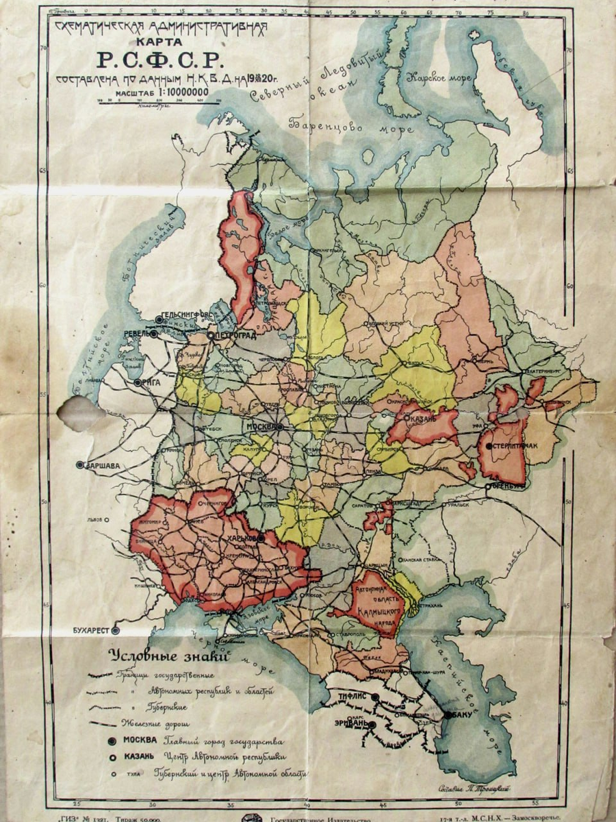 Возникшая годом ранее советская Белоруссия была так мала, что автор этой карты конца 1920 г. ее просто не заметил (она совпадает с изображенной им Минской губернией): Кстати, карта довольно загадочная. Автор был, видимо, старорежимный (на это намекают ар-нувошные шрифты) и просто не понимал, как так может быть, что Украина – не Россия, потому включил ее в карту РСФСР, а вот закавказские республики и Дагестан (но не Абхазию) не включил. Равно как и Киргизскую АССР (будущий Казахстан), в состав РСФСР входившую.