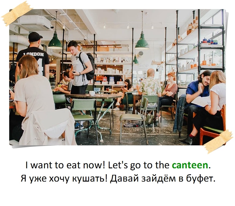 Canteen - столовая, буфет; используется в значении общественного места, где можно перекусить.