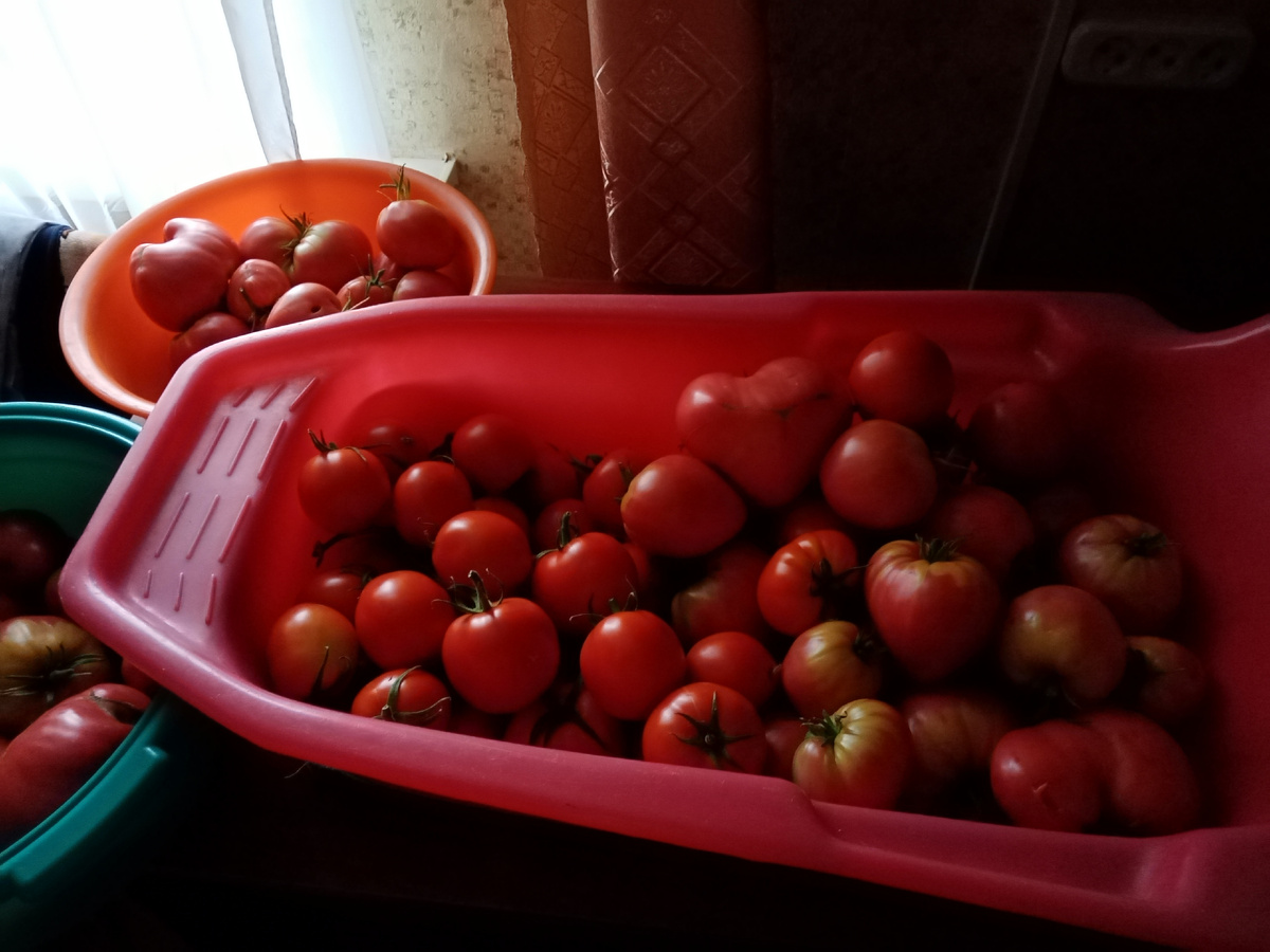 Спешу и я поделиться плодами своих трудов.) Вчера день был борьбой за урожай. Обобрала одну теплицу с помидорами. Когда-то сына купала, теперь помидоры.) Эх! Света маловато, слева бычье сердце. Крупный, спелый, чуть заденешь и дырка. И таких сердец, сердечек и сердечат много залезло в банки. Выход помидорный: Рецепт соуса: томаты разные, пропущенные через сокоотжималку, литров 7. Около 2 кг яблочек наливных, тоже через мясорубку. Туда же болгарский перчик штук 10. Соль, сахар по вкусу, приправы: гвоздика и укроп. А сейчас затеяла голубцы, варю капусту.