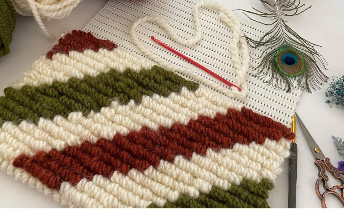 Из простого нескользящего коврика можно сделать полноценный, мягкий ковёр с интересным узором! Достаточно лишь взять крючок и толстую пряжу, чтобы повторить этот мастер-класс. Присоединитесь коврик сбоку пряжей. Наберите 15 петель через 15 отверстий в ряду коврика. Провяжите их вместе, обрежьте нить, завяжите на узел. В следующие 15 петель вставьте пряжу другого цвета, вытяните. Также провяжите вместе и зафиксируйте на узел. Каждый ряд смещайтесь разными цветами пряжи на одну петлю в сторону, чтобы получился красивый узор!
