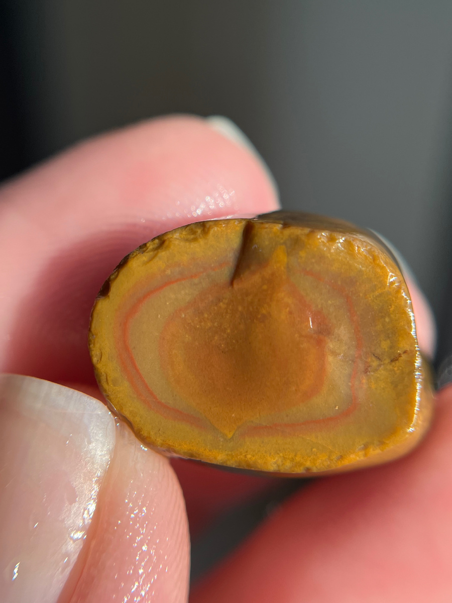 Гуляла по пляжу и нашла вот такую половинку камня. Рисунок мне показался интересным. Еще и такая рамочка красная. Тот случай, когда не нужно пилить или полировать. Он прекрасен сам по себе. Подарила сыну. Он сказал это тыква или луна. У трехлеток свое видение на все в этом мире. А что видите вы?