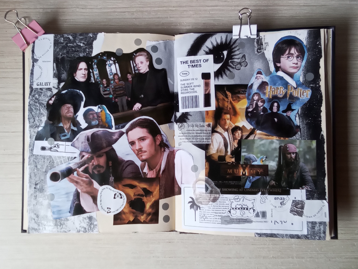 Всем чернично-космический привет! Потихоньку продвигаюсь вперёд в марафоне коллажей. Немножечко устала, но хочу доделать все задания. Сделала ещё два задания. Первое из них звучало так: любимые фильмы о лете, серый, кинослайд. Фильмы о лете... Я решила сделать оформление любимых фильмов, которые смотрю исключительно летом. А это: три части "Пиратов Карибского моря" (лето не лето без приключений Джека и его команды), все фильмы вселенной Гарри Поттера (может, мне в этом году наконец-то пришлют письмо из Хогвартса) и две части "Мумии". Для коллажа распечатала кадры из фильмов. А вот серый цвет искала в журналах. Немного светлых наклеек, а то без них работа казалась тёмной. Чтобы выполнить следующее задание, пришлось идти на прогулку за цветами. Ведь по заданию нужно было совместить композицию из гербария, жёлтый и чашечку кофе. Я не умелец в засушке растений, пару раз сушила листики в книге и все. А нужно побольше цветов. В общем, более-менее удачные после засушивания отправились в к