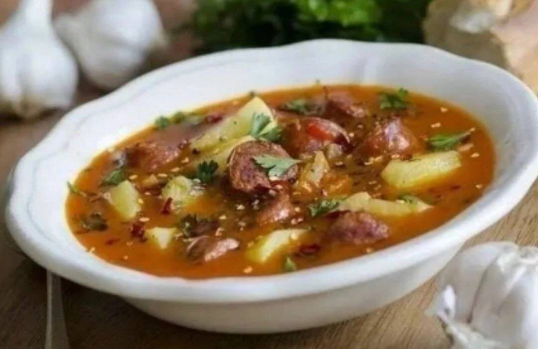 Острый испанский суп с колбасками Ингредиенты: Куриный бульон — 4 л Картофель — 4-5 шт. Помидоры — 1-2 шт. Колбаски охотничьи — 3-4 шт. Чеснок 1-2 — зубчика Свежая зелень Болгарский перец — 1 шт. Лук — 1 шт. Паприка Специи Приготовление: 1. Нарежьте охотничьи колбаски и обжарьте их в сковороде в оливковом масле. 2. Также в сковороду добавьте нашинкованный чеснок, морковь, острые специи, лук, натрите помидоры, порежьте болгарский перец, паприку. Обжаривайте в течение 5-7 минут до появления на колбасках золотистой корочки. 3. Разогрейте куриный бульон и добавьте нарезанный картофель, жареные колбаски с овощами, соль, специи, нарежьте зелень, добавьте черный и красный перец. Доведите до кипения и на медленном огне готовьте 10 минут.