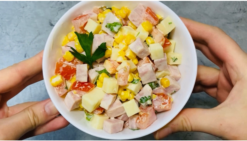 Салат с ветчиной, сыром, кукурузой и помидорами - яркий и вкусный салат для любого повода