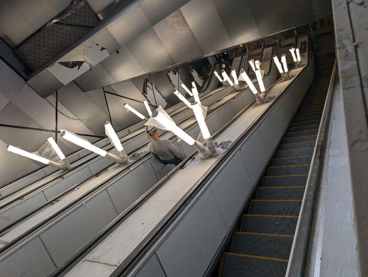 📷 1.1: В эскалаторном наклоне подключены светильники, ведется наладка эскалаторов для их обкатки.