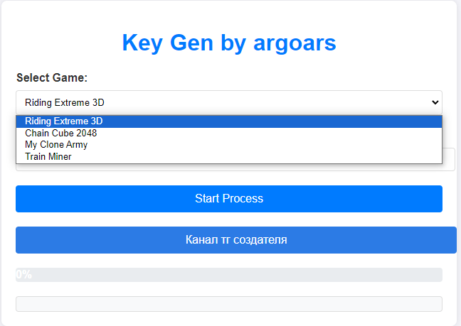 Сперва хотелось бы вспомнить, что ранее я уже делал генератор ключей и он работал, но времена поменялись и теперь нужно больше ключей! Для этого я и пишу эту статью т.к уже работает мой сайт с генерацией ключей для всех мини игр - ссылка. Перейти на сайт по ссылке и выбрать нужную мини-игру Выбрать нужное кол-во ключей (максимум 4) и начать кнопку "start" Также если у вас есть желание поддержать меня денежкой, то вот адрес кошелька usdt trc20 - TLFS4m87ALUw4BSsSzVE1Zze8yZmx1Hhk8