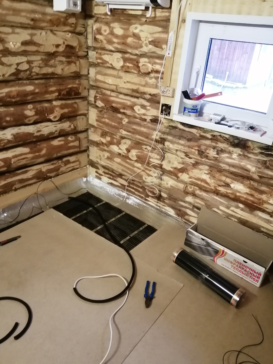 Главное перед монтажом, что бы пол был более менее ровный. Я стелил на черновой пол из 50 доски фанеру 12мм. Далее укладываем подложку и расстилаем пленку. Обычно в комплекте идет все необходимое. Зажимы, провода... Далее по технологии стелят пленку, но я не стал заморачиваться и сразу кинул ДВП. Поставил отдельный автомат. Все. Укладывать пленку по всему периметру нет смысла, только там , где нет мебели и часто находитесь в этой зоне. И финишный слой линолеум.