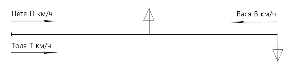 Три школьника — Петя, Вася и Толя — соревнуются в беге на дистанции AB. Если Петя и Вася одновременно выбегут из пунктов A и B навстречу друг другу, а Толя выбежит с ними одновременно, то Петя и Вася встретятся в тот момент, когда Толя пробежит всю дистанцию. Если Петя и Толя побегут навстречу друг другу, а Вася выбежит с ними одновременно, то Петя и Толя встретятся в тот момент, когда Вася пробежит половину дистанции. Какую часть дистанции успеет пробежать Петя к моменту встречи Толи и Васи, если они побегут навстречу друг другу? Петр и Василий пробегают S км со скоростью сближения (П+В) км/ч, а Анатолий пробегает те же S км со скоростью Т км/ч. Получается, что Т=П+В Петр и Анатолий пробегают S км со скоростью сближения (П+Т) км/ч, а Василий пробегает S/2 км со скоростью В км/ч (на весь путь ему нужно в 2 раза больше времени). Выходит, что П+Т=2*В П+В=Т П+Т=2*В Вычитаем из первого равенства второе. П+В -(П+Т)= Т-2*В 3*В=2*Т Теперь перепишем равенства так П-Т=-В П+Т=2*В И сложим их 2*П