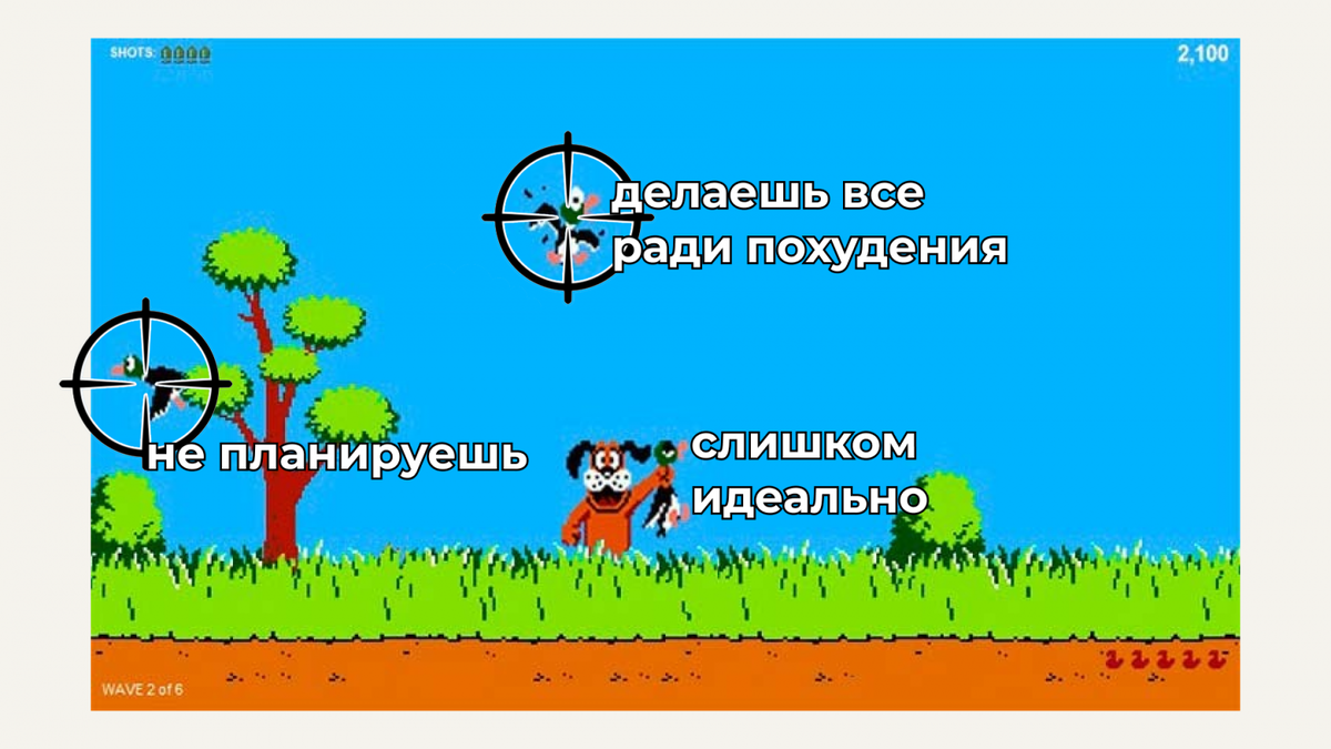 Похудение — это временное условие, соблюдаемое до определенной цели. Но инструменты похудения не временны и должны стать частью образа жизни, а для этого в какой-то момент образ жизни нужно подстроить под эти инструменты. Тогда они из чужеродных станут естественными, отражающими вас постоянных, а не временных.