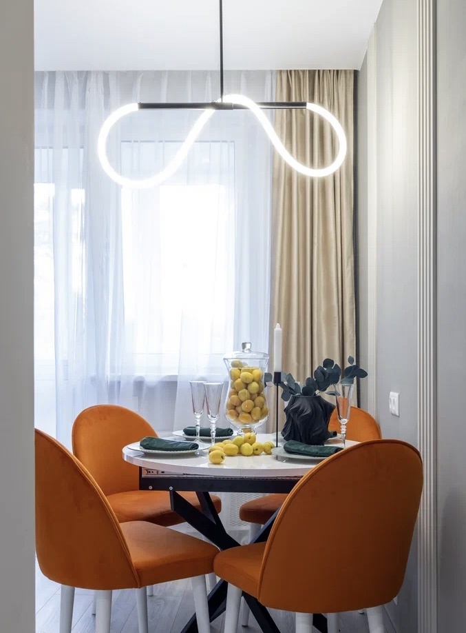 Разработать комфортное и красивое пространство для жизни на небольшой S - задача не самая простая! Проект 1-комн. квартиры площадью 42 м2 стал «креативным вызовом» нашей команде💪🏻 И мы отлично справились, уместив гостиную, спальню, вместительные шкафы и полноценную кухню в небольшом пространстве, при этом оставив место для жизни 😊. ## Стилистика интерьера: минимализм с изюминкой Интерьер выполнен в современном минимализме с элементами скандинавского дизайна. Чистые линии и нейтральные цвета создают ощущение легкости, а яркие оранжевые акценты добавляют живости, словно говорят: «Не волнуйся, жизнь — это весело!» ## Зонирование: двоичное чудо В жилой комнате получилось две зоны — гостиная и спальня — без ущерба для хранения. Гостиная выглядит так, будто всегда готова к вечеринке. Диван легко превращается в кровать для загостившихся друзей, а вместительные шкафы делают свое дело, пряча ненужные вещи, словно волшебники в мантиях. ## Кухня: сердце квартиры Кухня в этом проекте