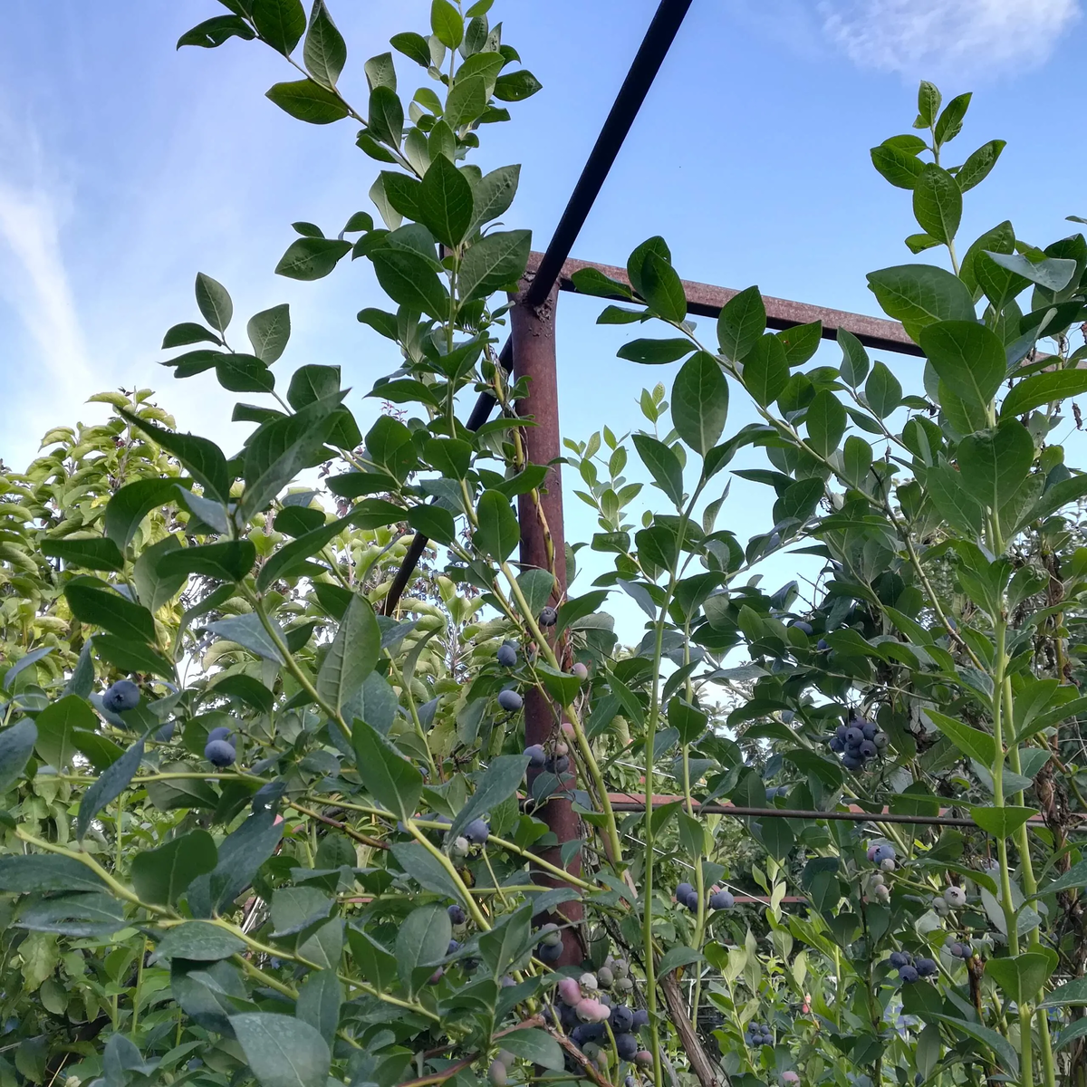 А что же голубика высокоролая, растущая рядом? Так кусты тоже вырастают небывалой высоты, до 2,5 метров и выше, в условиях климата Сибири. Ниже на фото шпалерная конструкция имеет высоту 2,5 метра. Так вот приросты у голубики на 20 см выше этой шпалеры. На фото куст голубики сорта Nelson.