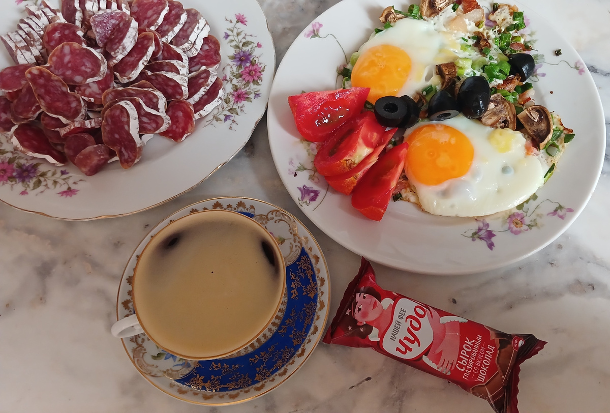 Экономное питание на 226 руб в день Завтрак сегодня обычный воскресный. Как правило, готовим яичницу в разных вариантах. Сегодня яичница с беконом, грибами, зеленым луком, еще чуть сыром посыпала (были остатки тертого сыра в холодильнике). Добавила еще помидоры и маслины к яичнице. Нарезка фуэта. И творожные сырки к кофе. после завтрака мы все уехали на экскурсию на Очаковский комбинат. Там была дегустация кваса и лимонадов, напились вволю 😀 После дегустации зашли еще в их магазин, купили домой квас и лимонад. А приехали уже в 16.30. На скорую руку сделали дежурное блюдо - макароны с сосисками. К макаронам добавили соус песто. Салат на обед - капуста с помидорами и чесноком Готовил обед младший. Старший гулял с собакой. Мы с мужем закупались в Магните. Распределила всем обязанности, чтобы все побыстрее поели и при этом сделали необходимые дела. После обеда пили квас из черной смородины и мяты с вафлями. А вечером еще пили пряное какао-латте с шоколадными вафлями Какао необыкновен