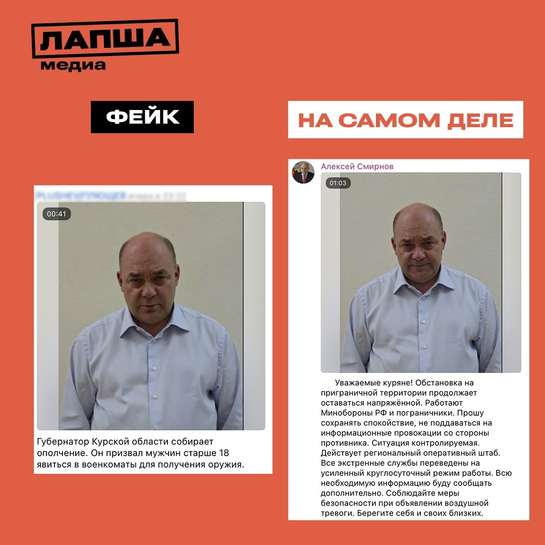В сети появилось фейковое обращение врио губернатора Курской области Алексея Смирнова на фоне попыток прорыва ВСУ на приграничных территориях региона. Украинские ЦИПсО взяли за основу реальное видео со страницы врио главы региона и создали дипфейк, заменив текст обращения на призыв молодых людей «явиться в военкомат для получения оружия». На недостоверность видео указывает неестественное движение мимики лица и губ, механический однотонный голос, сгенерированный ИИ. В реальном видео речь шла о текущей обстановке на приграничных территориях. «Работают Минобороны РФ и пограничники. Прошу сохранять спокойствие, не поддаваться на информационные провокации со стороны противника. Ситуация контролируемая. Действует региональный оперативный штаб. Все экстренные службы переведены на усиленный круглосуточный режим работы», — заявил врио губернатора Курской области. Ранее по сети прокатилась волна вбросов о необходимости эвакуации для жителей региона и предстоящем захвате Курской АЭС, а также о то