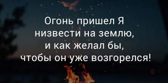 Огонь пришел Я низвести на землю, и как желал бы, чтобы он уже возгорелся! (От Луки 12.49) Известное всем Евангельское выражение Иисуса непонятое многими и сегодня тем не менее имеющее в своей основе весь смысл человеческой эволюции. Так какой огонь пришел низвести на землю Иисус? В древних писаниях было сказано – Бог есть Огонь! Так же можно вспомнить и другое выражение Иисуса по этому поводу – вы Боги!