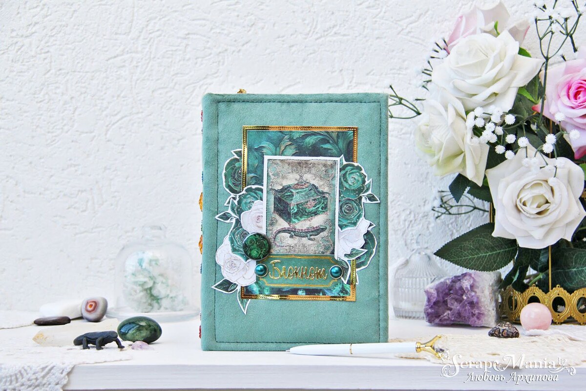 Всем привет! Сегодня с вами я, Любовь Архипова. Не так давно вышла новая коллекция "Малахитовый цветок" TM ScrapMania, которую мы ждали давно. Она является продолжением серии из коллекций "Марсала", "Королевский сапфир", "Пионовый роман". Очень благородная и универсальная. Для меня эта коллекция ассоциируется со сказками Бажова про Хозяйку Медной горы. Мне очень захотелось сделать из этой коллекции малахитовый блокнот. Уж очень сильно мне понравились принты в этой коллекции, поэтому захотелось оставить обе стороны. Мой блокнот вышел по формату А5. Обложку я обтянула красивой бархатной тканью цвета малахита. На корешок пришила разных самоцветных каменьев. Саму обложку украсила вырубленными из зеркального золотого картона и скрап-бумаги прямоугольниками, сделанными ножом "Прямоугольники со строчкой". Так же на лицевой части обложки красуется тканевая карточка "Малахитовый цветок. Шкатулка" и фишка с зелеными розами из набора "Малахитовый цветок". Мне очень нравятся блокноты с практичным