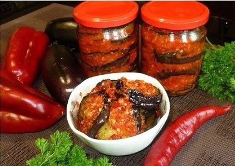 Очень вкусная закусочка на зиму или как приправа к вторым блюдам. Хранится долго. Очень вкусно! ⠀Забираем в копилочку ✍ Ингредиенты: - 2 кг томатов, - 1 кг баклажанов, - 1 кг болгарского перца, - 5 стручков острого перца, - 300 г чеснока, - пучок кинзы или петрушки, - 250 мл растительного масла, - 2 ст. ложки соли или по вкусу, - 1 ст. ложка сахара, - 100 мл 6% уксуса Приготовление: 1. Помидоры помыть, удалить место где крепилась плодоножка. Порезать дольками или пополам. Рекомендую использовать мясистые помидоры. 2. Болгарский и острый перец помыть, удалить семена, плодоножки и перегородки. Порезать частями. 3. Чеснок почистить. 4. Пропустить помидоры, перцы и чеснок через мясорубку. 5. Баклажаны помыть, удалить плодоножки и порезать кубиками или кружочками. Мне больше нравится когда баклажаны порезаны кружочками, тогда получается острая и вкусная закуска. 6. Зелень измельчить. 7. В глубокую кастрюлю выложить все овощи. Влить растительное масло. Добавить соль и сах