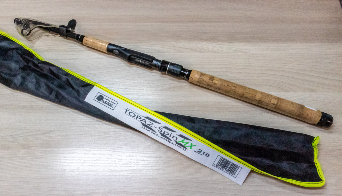 Итак, в моих руках телескопический спиннинг AQUA Topaz-spin MX 210, который по ТТХ прекрасно отвечает задачам, которые я перед ним ставлю. А это и удобная мне длина 2,1 метра, и внушительный диапазон по тесту от 5 до 25 грамм, и довольно любопытный, можно сказать универсальный строй, позволяющий ловить самыми разными типами приманок: воблеры, джиг, блесны. При этом, AQUA Topaz-spin MX 210 оказался неожиданно легким и, по факту, мой экземпляр весит всего лишь на пару грамм тяжелее заявленных в описании 165 грамм. В целом - это интересный спиннинг и, очевидно, что стоит рассказать о нем поподробнее. Начну с того, что мне нужен был легкий и вместе с тем крепкий спиннинг позволяющий быстро и удобно собирать снасть. Т.е. пришел на рыбалку, раздвинул удилище, нацепил на застежку приманку и начал ловить. На все про все - меньше минуты. Еще быстрее можно сделать в обратном порядке по окончании рыбалки или переходе/переезде на иное место. С удобно сложенным телескопическим AQUA Topaz-spin MX 21