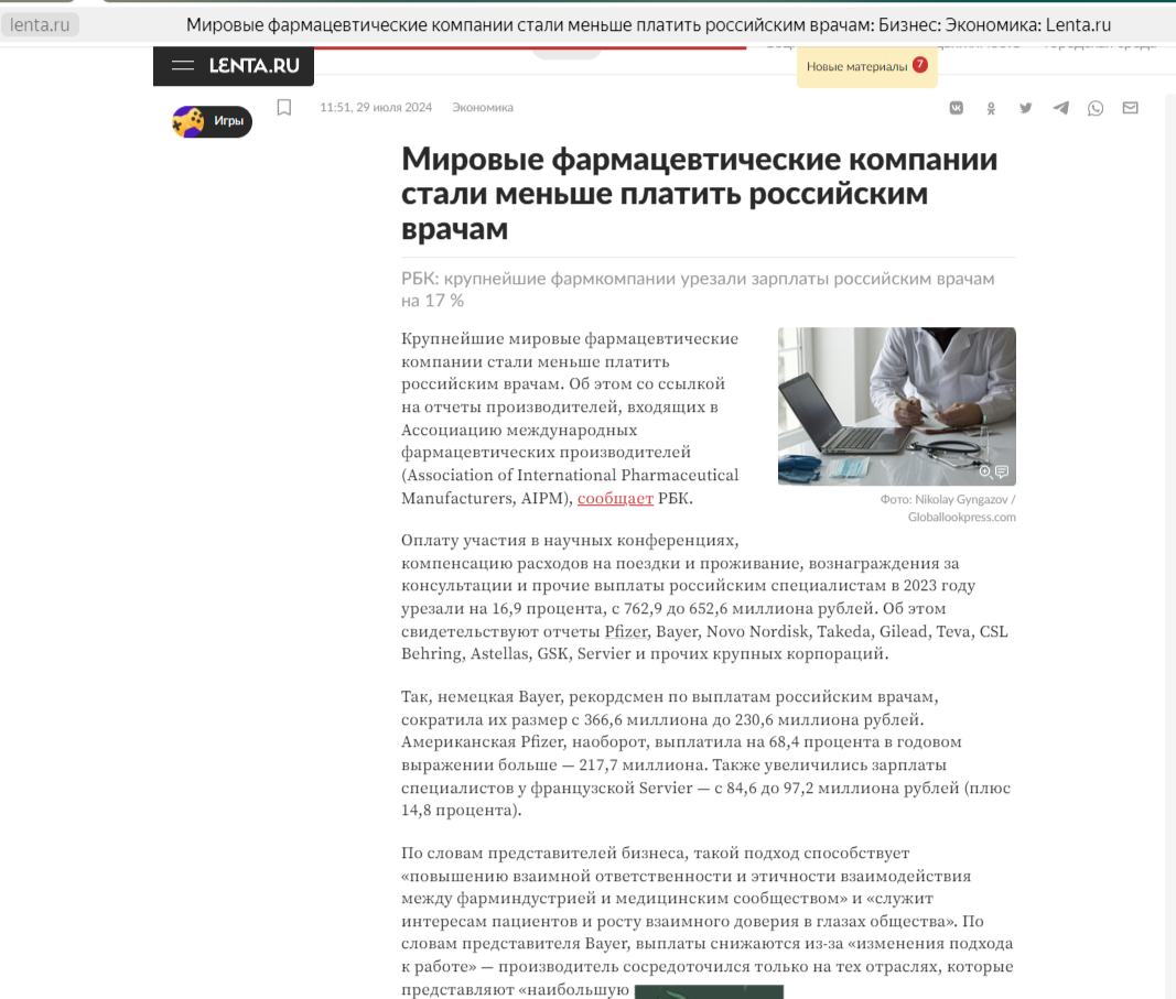 Никому не показалось странным поведение РФ-ных врачей в тот самый период? Они все, как один, в РФ и по всему западному миру дудели в одну дуду. дудели, что - если не уколоться, то умрешь - если не наденешь трусы на лицо - тоже умрешь - если не сообщишь ку-ар код при выходе из дома из самоизоляции, тоже умрешь. Мало кому тогда пришло в голову, какие колоссальные деньги на этом были заработаны - одна мадам Арбидолиха со своим мужем и с мадам Роспотребпозор насколько обогатились! А,ведь, без послушных врачей и медперсонала такое не провернуть. И, чтобы им было приятней слушаться, БИГ-ФАРМА им щедро оплачивала их "допиздержки". Но, народ очухался. И понял, как его нагло обманули. И теперь - БИГ-ФАРМА экстренно сокращает свои щедроты из-за резкого падения прибыли. Планы пошли не по плану. Ожидаемость не оправдала действительность. Увы. Лафа рф-ных белохалатников кончилась! - крупнейшие мировые фармацевтические компании стали меньше платить российским врачам: А с 1 сентября 2024г - факцин