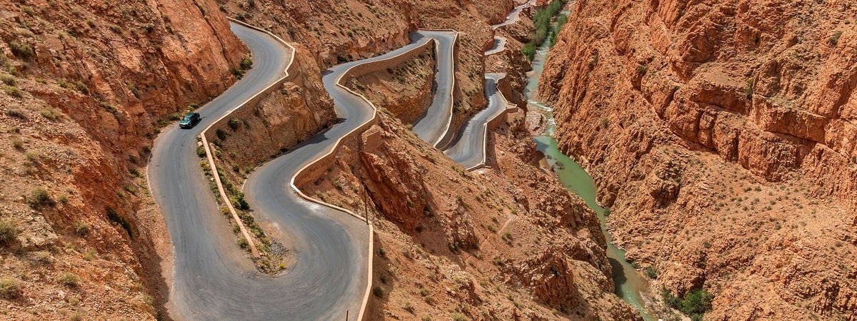 Трасса проходит через пустынную местность с марсианскими пейзажами, вьется серпантином вдоль изумрудной реки Зиз, выводит к пальмовым оазисам и берберским поселениям в ущелье Дадес.
