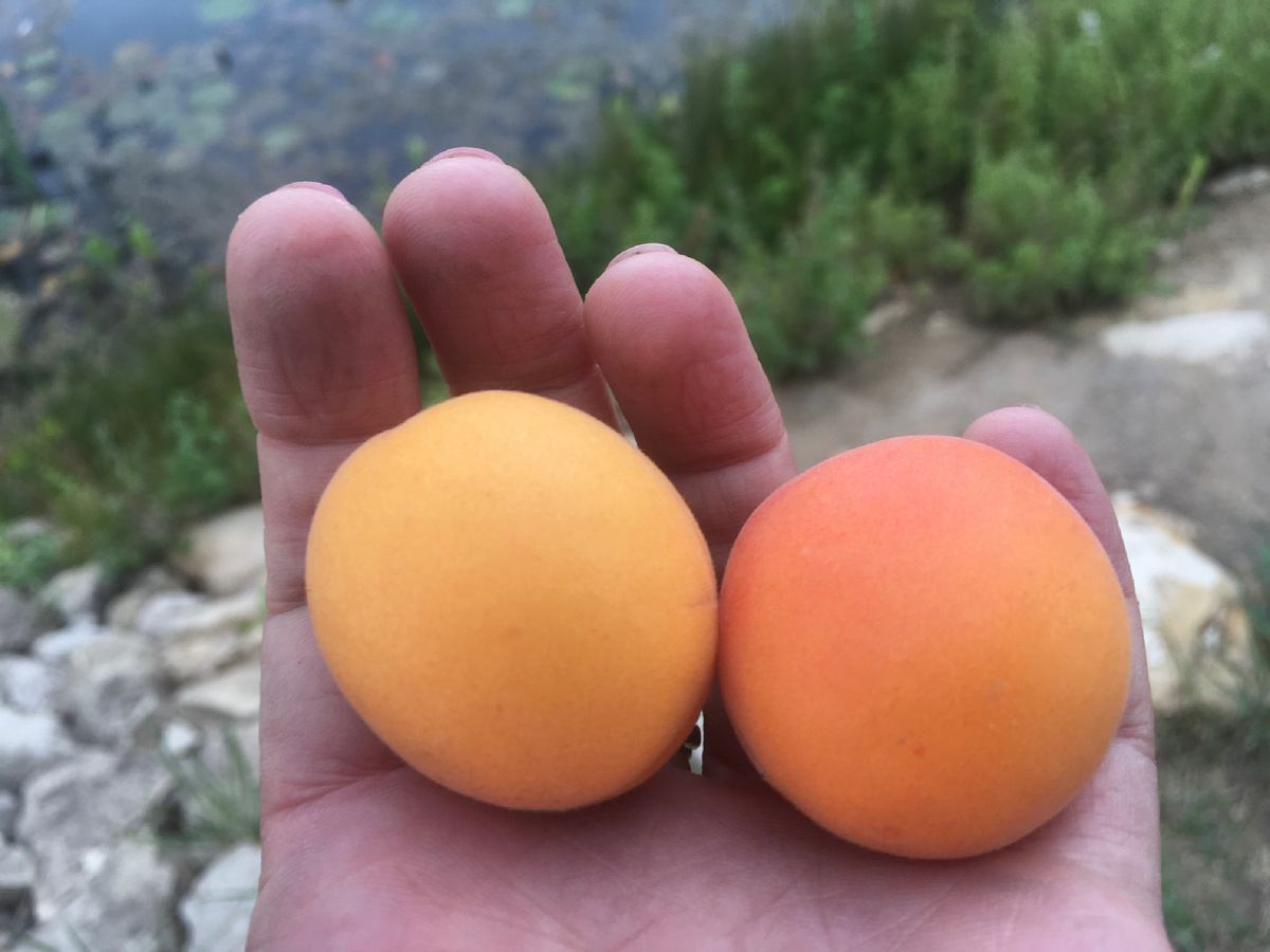 Этот год нас порадовал полноценным урожаем абрикосов, не смотря на весеннюю придурь погоды. У нас земли рискованного земледелия (а мне интересно, где же не рискованного). И если абрикосов нет, то их нет нигде, по всей области. А если они есть, то есть везде в несметном количестве. Но этот год аномален во всем. Каким-то чудом нас обошли весенние заморозки, а вот по области у многих померзли абрики. И даже вишня. Про виноград, понятно, что и речи нет. Так вот. У нас в этом году плодоносило два дерева. Хочу вам рассказать о них. Вот два абрикоса. Они разные, хоть визуально весьма похожи. Даже и не сказать, что с разных деревьев. С первым деревом целая история. Название сорта неизвестно. Просто абрикос. Я, уроженка Волгограда, где море фруктов, да еще каких, тут, в Саратовской области не ела ничего такого лет десять точно. Потом начала потихоньку привыкать. Вполне себе растут тут приличные абрикосы, и, даже неплохие персики. Так вот это дерево мы хотим вырубить уже года три как. Снача