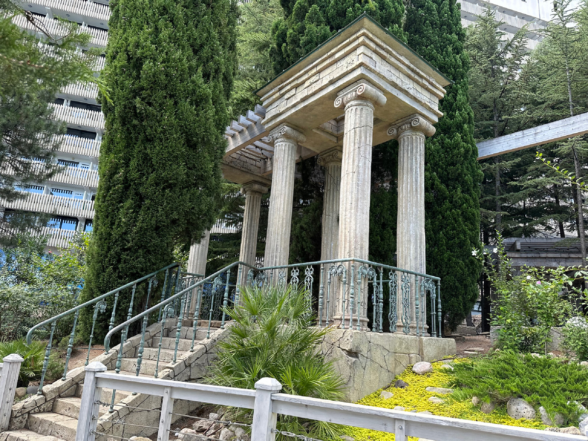 Пока я готовлю для вас статью об условиях проживания в «Ялта-Интурист», расскажу об одном из мест на территории отеля, полюбившимся моим мальчикам. Прогуливаясь по аллеям, наш взор привлекли колоны. Сначала мы решили, что это просто декоративное украшение. Но у моих детей есть негласное правило – видят ступени, нужно удовлетворить любопытство и разведать что же там наверху. Вот и поднялись мы. Тем более, что ступенек всего ничего. А там нас ждало нечто интересное. Место уединения и релакса. Между вековых сосен, тут и там, висели кресла с подушками. На них сидели люди. Кто-то покачивался в наушниках , кто-то зависал в телефоне, кто-то читал, а кто-то просто дремал с книгой в руках. Мам, это похоже на читальный зал библиотеки Действительно, тишина и умиротворение наполняли это место. Лишь легкий ветерок обдувал присутствующих. На каменных полках библиотечного стеллажа можно найти несколько книг. Выбор, конечно, так себе. Больше бульварных романов в стиле Донцовой. Но мы стали приходи