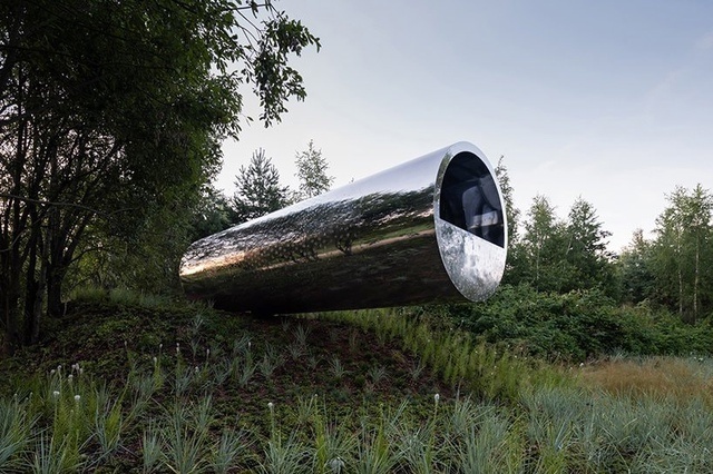 русское идеальное СЕРГЕЙ КУЗНЕЦОВ Архстояние 2021, «Личное» Арт-объект «Русское идеальное», придуманный главным архитектором Москвы Сергеем Кузнецовым для фестиваля «АрхСтояние» 2021 года, который проходил под девизом «Личное», кажется очень простым – и по задумке, и по исполнению, и по форме. Все это верно лишь в отношении формы: цилиндр есть цилиндр, и, как бы его ни называли иные остроумцы – «труба», «бочка», «ЦУБ», перед нами прежде всего цилиндрический каркас 12-метровой длины и диаметром 3,5 метра, который обшит 4-миллиметровыми листами из нержавейки, отполированными до блеска... ну, почти. Если же говорить о задумке, то здесь нет ни политического подтекста, как в слу- чае с провокационной инсталляцией эстонского архитектурного бюро Salto «Газовая труба» на Венецианской биеннале архитектуры 2008 года (почему неуместен ярлык «труба»), ни отсылок к Диогену и философской школе киников (почему не- уместен ярлык «бочка»), ни ностальгии по позднему Советскому Союзу и армейской жи