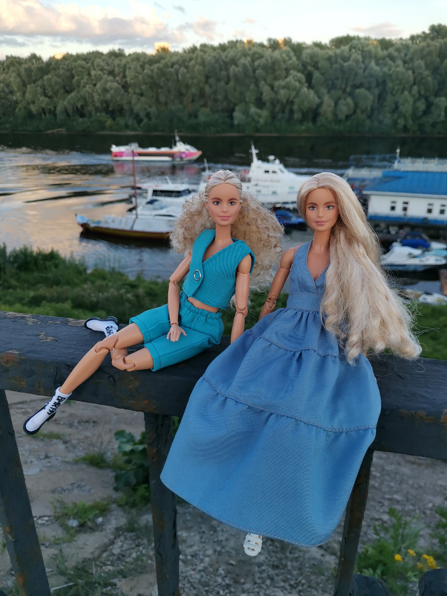 Спешу со своим видением голубого в кукольном мире! Прекрасный цвет, очень люблю его, столько вариантов его представления в голове было, но победило желание поснимать моих двойняшек Милли bmr1959 - Мелани и Мелиссу. Давно хотела обновить им совместные фото, а вот и повод нашелся) Мелисса в бирюзовом костюме, Мелани в голубом под джинсу платье. Так повелось с самого начала, что Мелисса активная хулиганка-спортсменка, а Мелани - мягкая женственная "девушка с книжкой". Сначала хотели пошалить и поменяться стилями в одежде, но Мелани настолько смешно смотрелась в спортивном, а Мелиссе было так неловко в романтичном платье, что в итоге оставили все как есть😁 Планировала их фотографировать совсем в другом месте, но не учла я тот факт, что в августе темнеет намного раньше, поздновато выехала, и опоздала на хороший свет. Пришлось срочно искать план Б! Нашли местечко в итоге на набережной с видом на Оку и стоящие здесь теплоходы и дебаркадеры. За спиной Мелани - Канавинский мост через Оку,