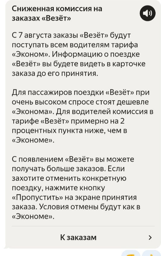 Всем привет, пару дней назад в сообщениях таксометра вылезло сообщение такого характера. Тариф "Везёт". Дешевле, чем эконом. Но комиссия, примерно, на 2% ниже. Мне уже приходило 2 таких заказа, в городе Первоуральск, и это было не 7 числа. Я так понимаю, сюда оно зашло пораньше для тестов. Выглядит это так. Т.е. грубо говоря, заказ без кэфа. Что-то мне это напоминает... Но об этом дальше. Также сейчас во многих новостных лентах вы можете встретить данную новость. С этой новости начну писать, то что думаю про данный тариф. Если что, вот та самая новость. Итак, очередное нововведение Яндекса. То ли для увеличения заработка, то ли для уменьшения цен для любимых экономщиков. Для которых такси не роскошь, а средство передвижения. Если углубиться в саму суть, то можно запросто сказать, что ни о каком увеличении заработка и речи не идёт. А для любителей экономить Яндекс сразу предупреждает, что не особо и дождетесь вы машину. То ли вы будете ждать машину 5 минут, то ли час. А с