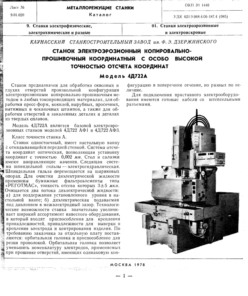 Технические характеристики на станок электроэрозионный копироволно-прошивочный кординатный с особо высокой точностью отсчета кординат 4Д722А