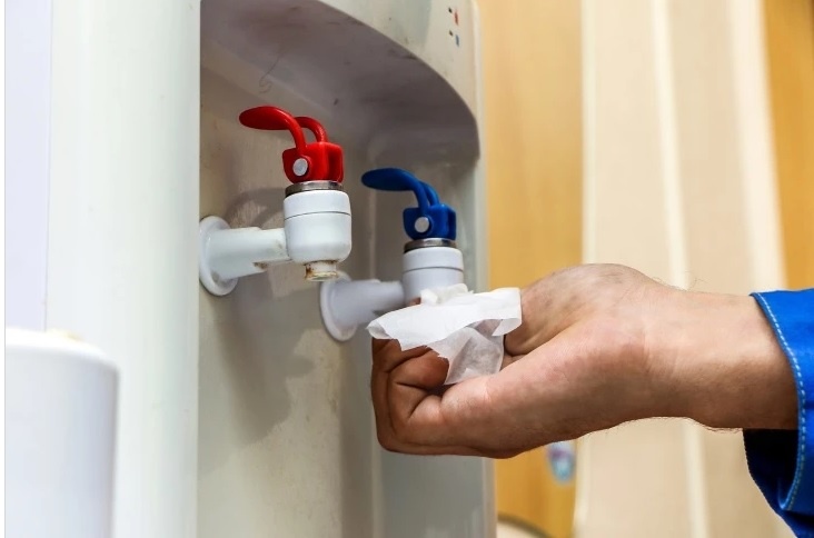 Нам часто приходится видеть кулеры, которые не чистились с момента покупки, поскольку мы устанавливаем системы обеспечения организация питьевой водой. Чаще всего кулеры в ужасном состоянии: с грязными разводами, сломанными рычагами, пыльным бутылоприемником. Чтобы этого не допускать, необходимо при каждой смене бутылки, полностью его протирать и дезинфицировать. Самая главная проблема — это не внешний вид. В замкнутом пространстве в бутыли с водой быстро начинают размножаться вредные бактерии. При наливе воды постепенно в кулере образуется прослойка воздуха, который попадает туда из помещения, и если вы используете бутыль больше недели, в этой прослойке воздуха начинают активно размножаться бактерии — для них эти условия благодатны. И, по сути, получается, что вы пьёте плохую воду. Следующая опасность — передача бактерий. Каждый офисный сотрудник подходит к кулеру, давит своей кружкой на рычажок, и льётся горячая или холодная вода. Предположим, что у кого-то грипп или другая инфекция,
