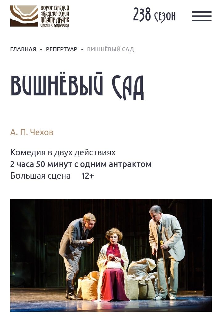 «Вишнёвый сад» —пьеса в четырёх действиях Антона Павловича Чехова, жанр которой сам автор определил как комедия. Это одно из самых известных произведений Чехова и последняя пьеса из «Ялтинских» после «Иванова», «Чайки», «Дяди Вани» и «Трёх сестёр». В пьесе хорошо передано характерное для Чехова сочетание комического и трагического,что становится особенно заметно ближе к концу. По сюжету помещица Раневская приезжает из Парижа в имение своего детства, которое выставляют на аукцион за долги. Купец Лопахин предлагает план спасения: снести старые постройки,вырубить вишнёвый сад и сдавать землю в аренду дачникам. Раневская в ужасе: для неё дом и сад полны сентиментальных воспоминаний. Откладывая решение, обитатели усадьбы философствуют, танцуют и тратят последние деньги, чем приближают трагичный финал пьесы. Существует великое множество толкований пьесы. Согласно одному из них, главным героем произведения являются не персонажи, а образ вишнёвого сада как символ дворянской России. По этой ве