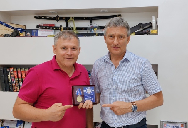 С большим уважением вручил Юбилейную медаль "30 лет профессиональному клубу тай-кикбоксинга "КИК" - Звёзды муайтай: Неваляшка, Бомбардир, Кувалда" - Дмитрию Юрьевичу Сторожеву Дмитрий Сторожев - Заслуженному тренеру России по тайскому боксу, Заслуженному работнику физической культуры РФ, директору Тренировочного центра подготовки сборных команд России "Крымский".