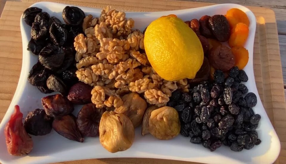 - темный изюм, чернослив, курага, инжир или финики (по 200 грамм);