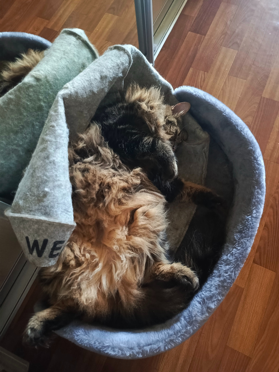 Всем привет! С вами Кузя Кусалочкин и сегодня я расскажу как смотрю телевизор и что я чуть не остался без месения халата. Утром я поел вкусняшку, как всегда. Потом проводил хозяина на работу и улегся спать. Сначала спал в такой позе: А потом в такой: Хозяин как ушел на работу, так быстро и вернулся. Приехал работать дома. Говорит, под кондишкой пересидел на работе, чихал. Но мне даже понравилось, что хозяин сидел дома, было не скучно. У нас немного прохладнее стало последние дни и я начал активничать, скакать. Вот и вчера скакал, опять хотел на балконе наверх запрыгнуть, но выше там некуда уже. Жаль.... И говорят, что у соседей меня так кормить не будут. Вечером с людишками телевизор смотрел. Хозяйка не сняла, но я прям увлеченно смотрел телевизор, наблюдал что там происходит. У меня такое бывает и довольно часто. Особенно мне нравится когда по телевизору животных показывают. Но сняла хозяйка только как я очень важно лежал: Я тут сама важность, еще и лапки так сложил. А вечером я