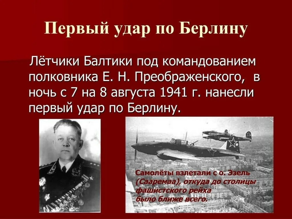 Бомбить Берлин в июле 1941 года, когда Вермахт за несколько недель захватил громадные территории на западе СССР, одни из самых густонаселённых и промышленно развитых? Такая идея могла посетить головы только смелых и инициативных людей! Враг реально угрожал захватом Киева, Ленинграда и Москвы, Более того, 22 июля 1941 года ВВС Германии - Люфтваффе предприняли первую массированную бомбардировку Москвы. Но ПВО московского региона оказалась крепким орешком: нацисты понесли большие потери. Уничтожить Москву, сровняв её с землей авианалётами, не получилось. А вот на суше казалось, что никакая сила в мире не способна остановить стремительное продвижение танковых клиньев фашистов. Идея бомбить Берлин многим в то тревожное время могла показаться безумной. Конечно, желание отомстить вероломному, жестокому и наглому врагу было огромно. Но как это сделать? Самым реальным был удар стратегическими бомбардировщиками по наиболее важным объектам на территории противника. В первые дни войны были произведены массированные бомбардировки нефтяных промыслов Румынии, познала на себе авиационные удары сама Германия: территория Восточной Пруссии подверглась воздушным бомбардировкам в первые часы войны. Дальняя авиация регулярно наносила удары по наиболее важным целям врага. Они имели немалый эффект, но необходим был грандиозный информационный повод для поднятия боевого духа армии и народа. Таковым, несомненно, была бы бомбардировка Берлина. Это был бы очень болезненный щелчок по носу хвастливому нацистскому Агитпропу и нацисту №2 – Герингу, заявившему, что ни одна вражеская бомба никогда не упадет на землю Германии. Неужели можно было дотянуться до гнезда нацистских упырей тяжёлым бомбардировщикам с аэродрома на Украине, Смоленской области или из-под Ленинграда? Нет. А вот с авиабазы на острове Эзель в Балтийском море, находившейся под контролем Балтийского флота, вполне! Конечно, бомбовая нагрузка стратегов не могла быть большой, экипажи должны быть смелыми и опытными. Но ведь возможно! Точный расчёт, отличное знание техники и уверенность в экипажах боевых машин, мотивированные жгучим желанием жестоко отомстить немецким оккупантам, вот что легло в основу дерзкого плана нанесения удара по логову нацистов.