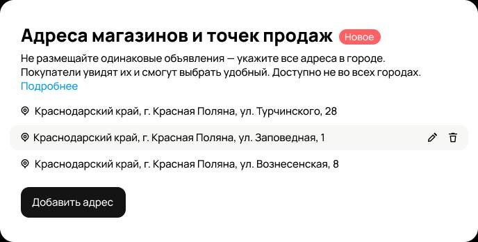 Если у вас несколько магазинов или точек продаж, то теперь вы можете указать их адреса в одном объявлении. При условии, что все эти магазины находятся в одном городе.
