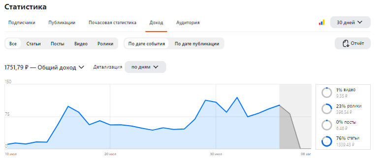 Сейчас я вышла на уровень примерно 50 рублей в день. А последнюю неделю удачно попала в очень актуальную тему и доход стал около 100 рублей в день. Но стоит сменить тему и станет меньше показов, будут меньше читать, соответственно и доход снизится.