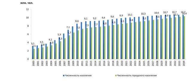 В период с 2024г. по 2034г. общая численность населения ОАЭ вырастет на 4,7% до 10,7 млн. человек. За тот же период численность городского населения ОАЭ вырастет на 2,5% и составит 10,4 млн. человек. Уровень урбанизации в 2024г. составил 89,2%, причем за 20 лет он вырос на 6,1 п.п. К 2034г. ожидается увеличение уровня урбанизации в стране до 96,9%.