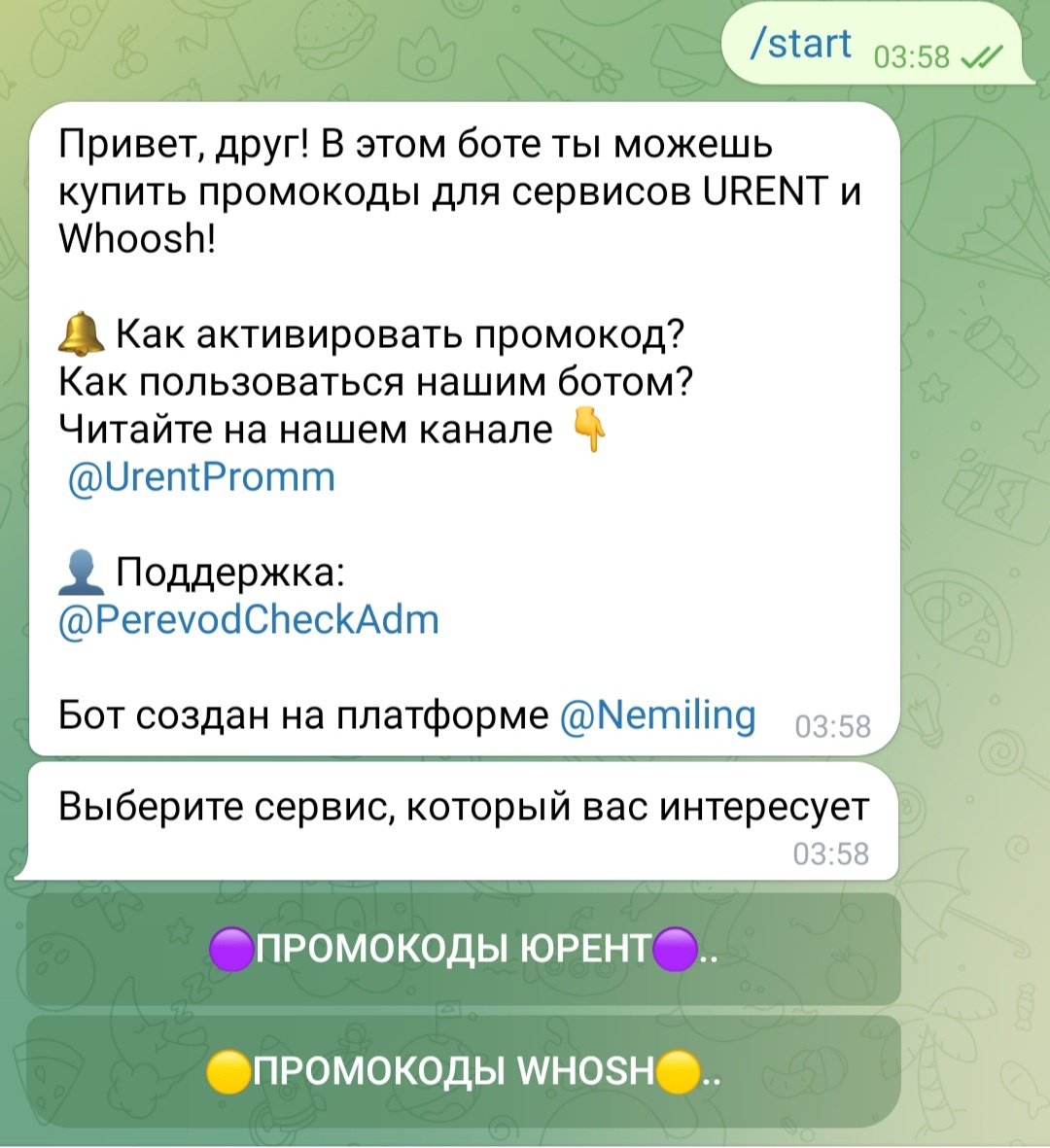 ССЫЛКА НА КАНАЛ С ПРОМОКОДАМИ В КОНЦЕ СТАТЬИ! Многие пользователи постоянно следят за появлением новых промокодов на любимые сервисы по прокату самокатов в надежде урвать хотя бы небольшую скидку. Но мало кто знает, что есть сервисы, где можно буквально за копейки купить промокод на пополнение баланса или бесплатные поездки. @UrentPromo1_bot - это бот в телеграме, который предоставляет такую возможность. К примеру за 10 руб вы можете купить промокод на пополнение баланса в Юрент на 100р! Всё интуитивно понятно! 1. Выбирает сервис 2. Выбираете нужный промокод 3. Оплачиваете 4. Вводите полученный промокод в приложении Готово! Ссылка на Телеграм канал данного сервиса👇👇