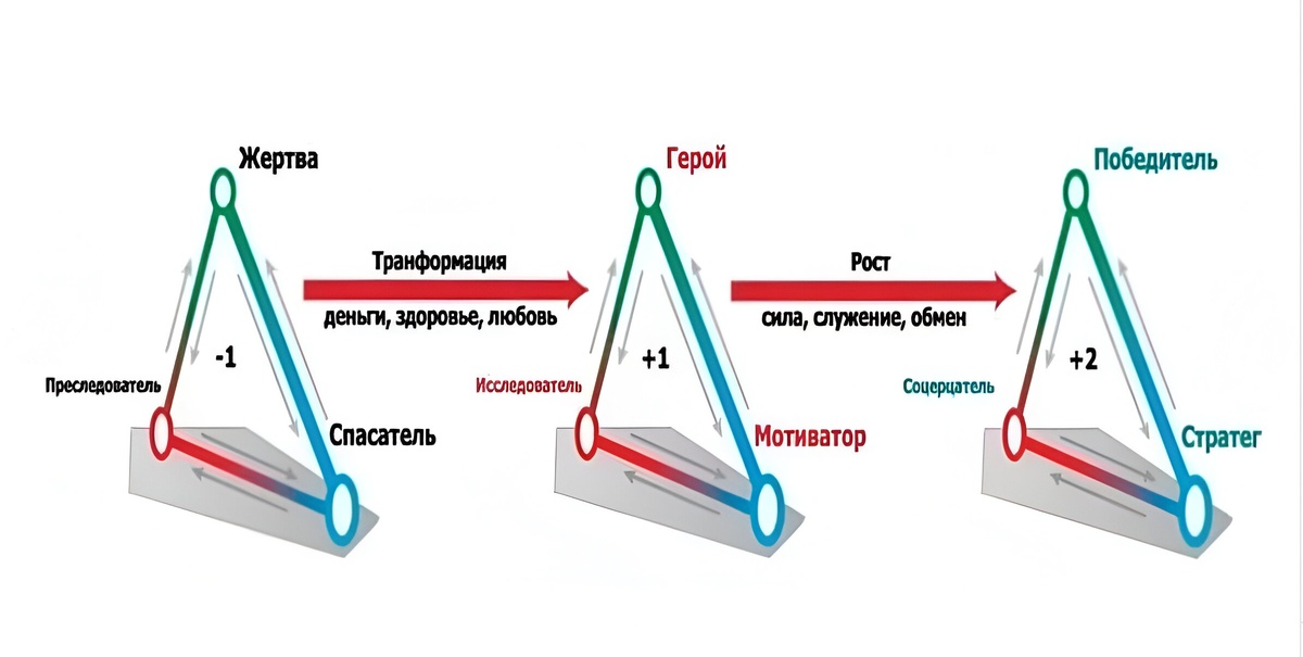 Первое правило – признать себе, что происходит вокруг вас, осознать свои чувства и желания. Понять, что вы хотите чего-то другого и готовы действовать иначе. Если ваши действия не приносят результатов, нужно изменить подход. Продолжайте менять свои действия, пока не достигнете желаемого результата. Сначала определите свою цель, которая станет переходом на следующий этап вашей жизни, к эволюции. На этом уровне уже существует второй треугольник с ролями: героя, философа и провокатора.